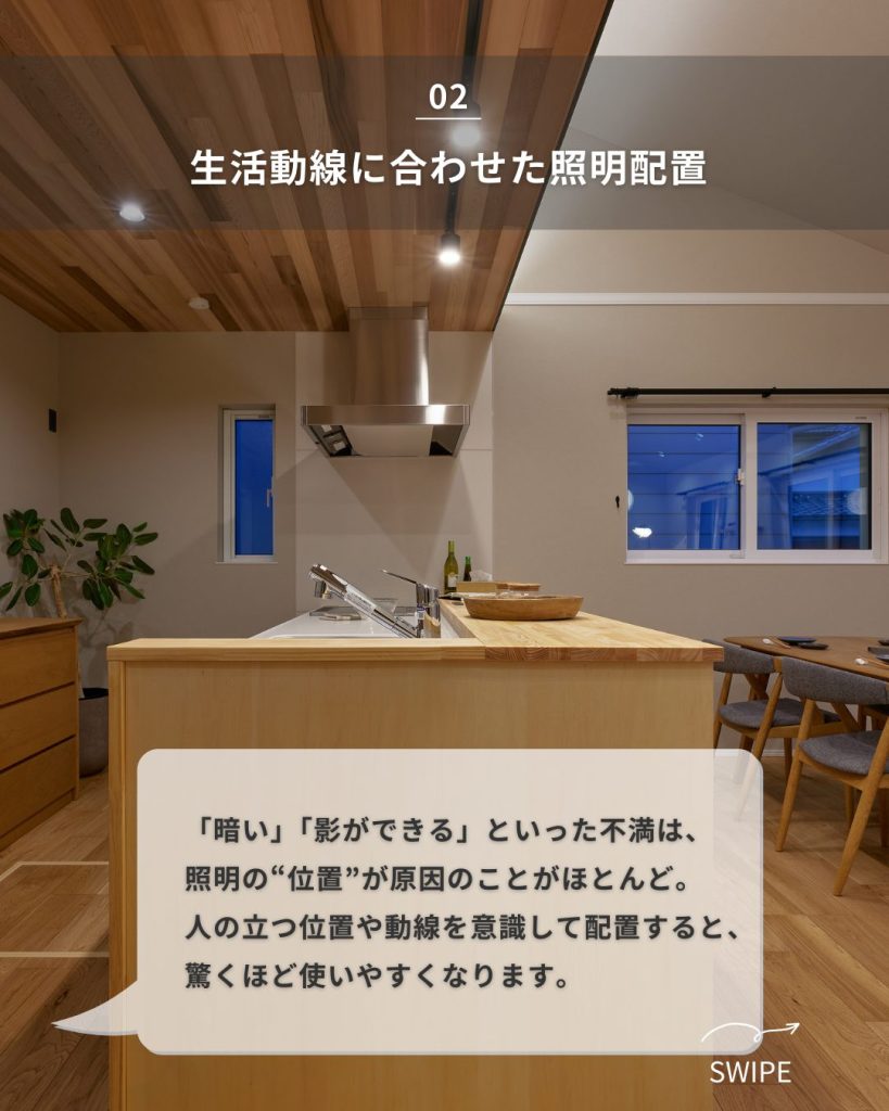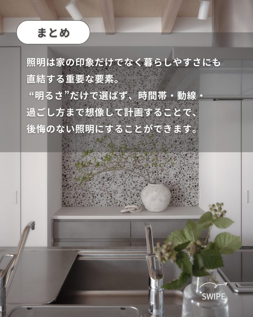 “明るさ”だけで選ばず、時間帯・動線・過ごし方まで想像して計画することで、後悔のない照明にすることができます😊