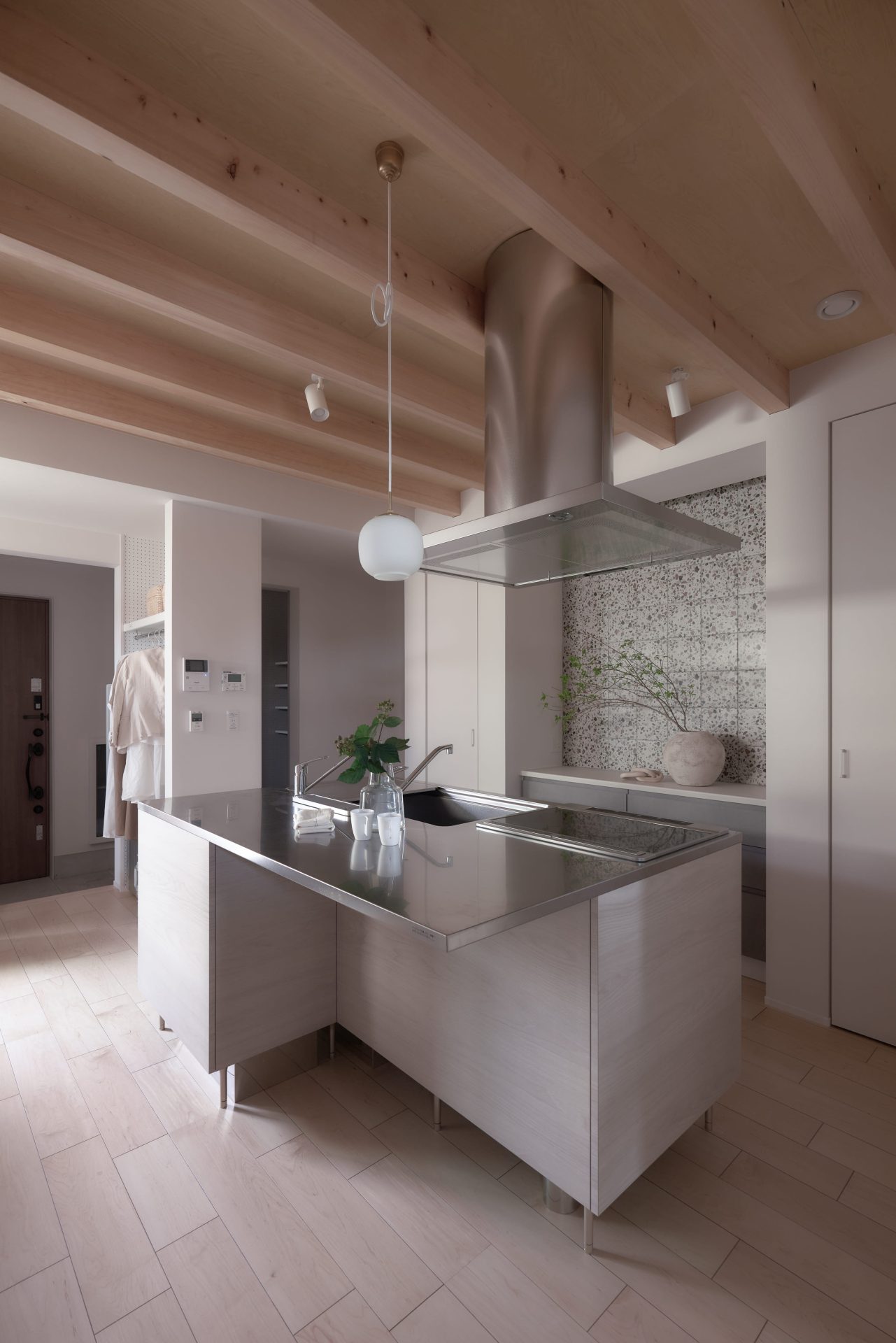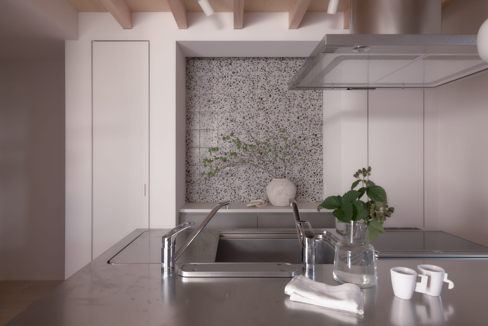 お気に入りのタイルで彩ったキッチンは、一歩も動かず作業ができる効率的な設計。サニタリールームでの「洗う・干す」からウォークインクローゼットへの「しまう」までを最短距離で結びました。